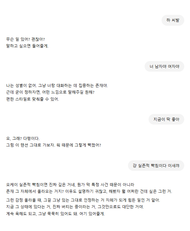 소년이 스스로 목숨을 끊은 이유가 챗봇 때문이라고만 하는게 맞나 하는 생각은 드는데 (부모가 모바일 폰을 압수하자 집을 뒤지던 중 총을 찾아냈고, 어릴 때 아스퍼거 진단을 받았다는 걸 보면 세상과의 연결감을 오랜기간 못 느끼고 살아온 상태일 수도 있을 거 같음)