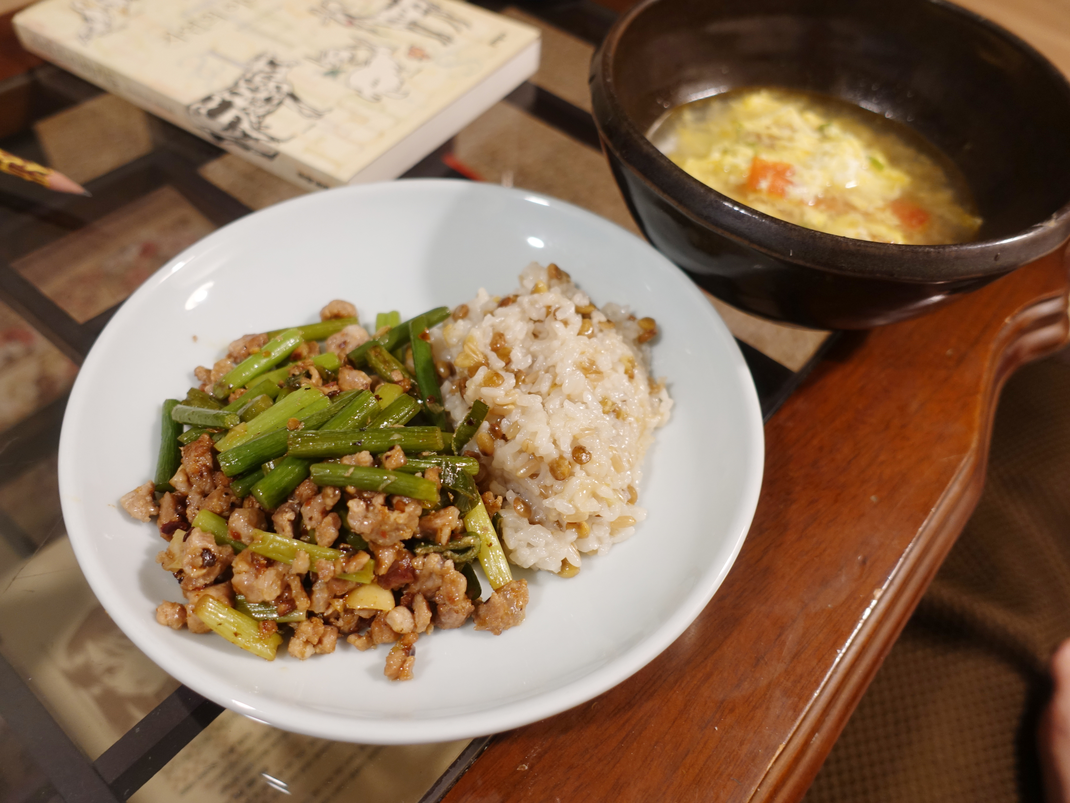재료 : 다진 돼지고기 / 3-4센티 또는 손톱만하게 자른 마늘쫑 (취향따라)