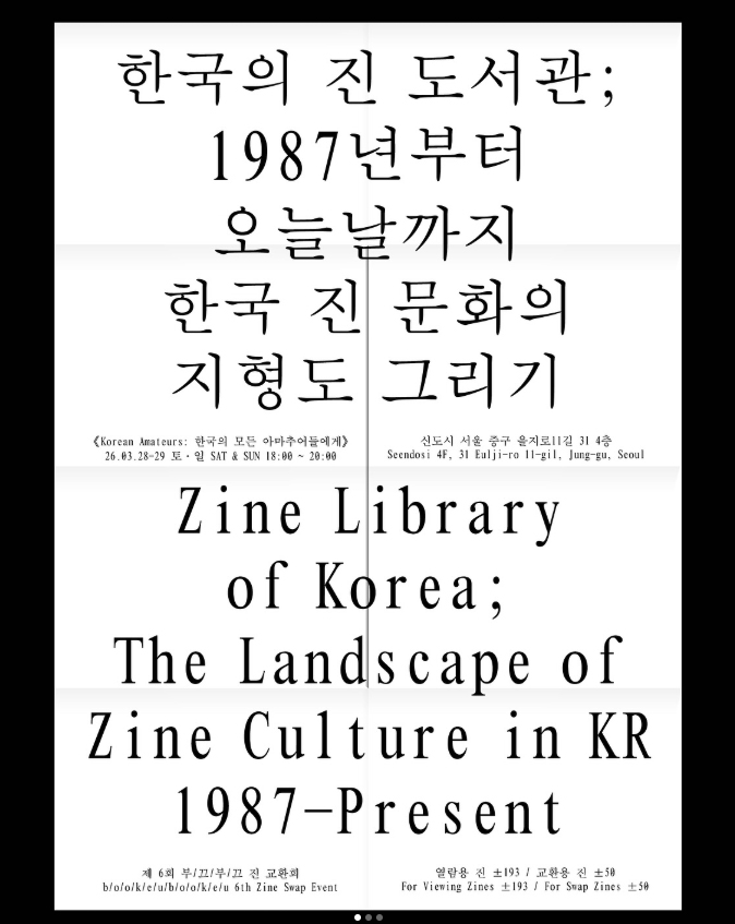 이번 전시는 논문 『1987년부터 오늘날까지 한국 진 문화의 지형도 그리기』를 바탕으로, 한국에서 다양한 집단을 중심으로 이루어져 온 출판의 흐름을 한 자리에서 살펴보는 자리입니다. ‘진(zine)’이라는 용어가 널리 사용되기 이전부터 오늘날에 이르기까지, 서로 다른 집단과 세대가 어떤 방식으로 출판을 실천해 왔는지를 함께 톺아봅니다. 전시장에는 연구 과정에서 수집한 다양한 진과 출판물들이 집단과 세대의 흐름에 따라 소개되며, 동시대 창작자들이 제공한 실제 진을 자유롭게 열람/교환할 수 있습니다.