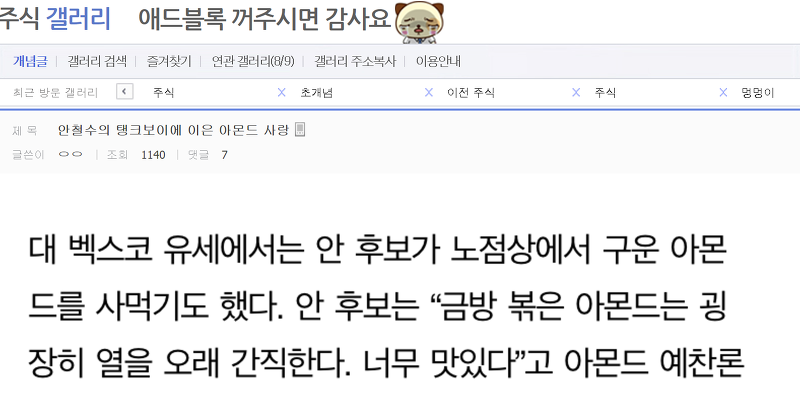 저번 대선땐 안철수를 찍었고 주변의 문재인 홍준표 지지자 모두에게 조롱당했다.