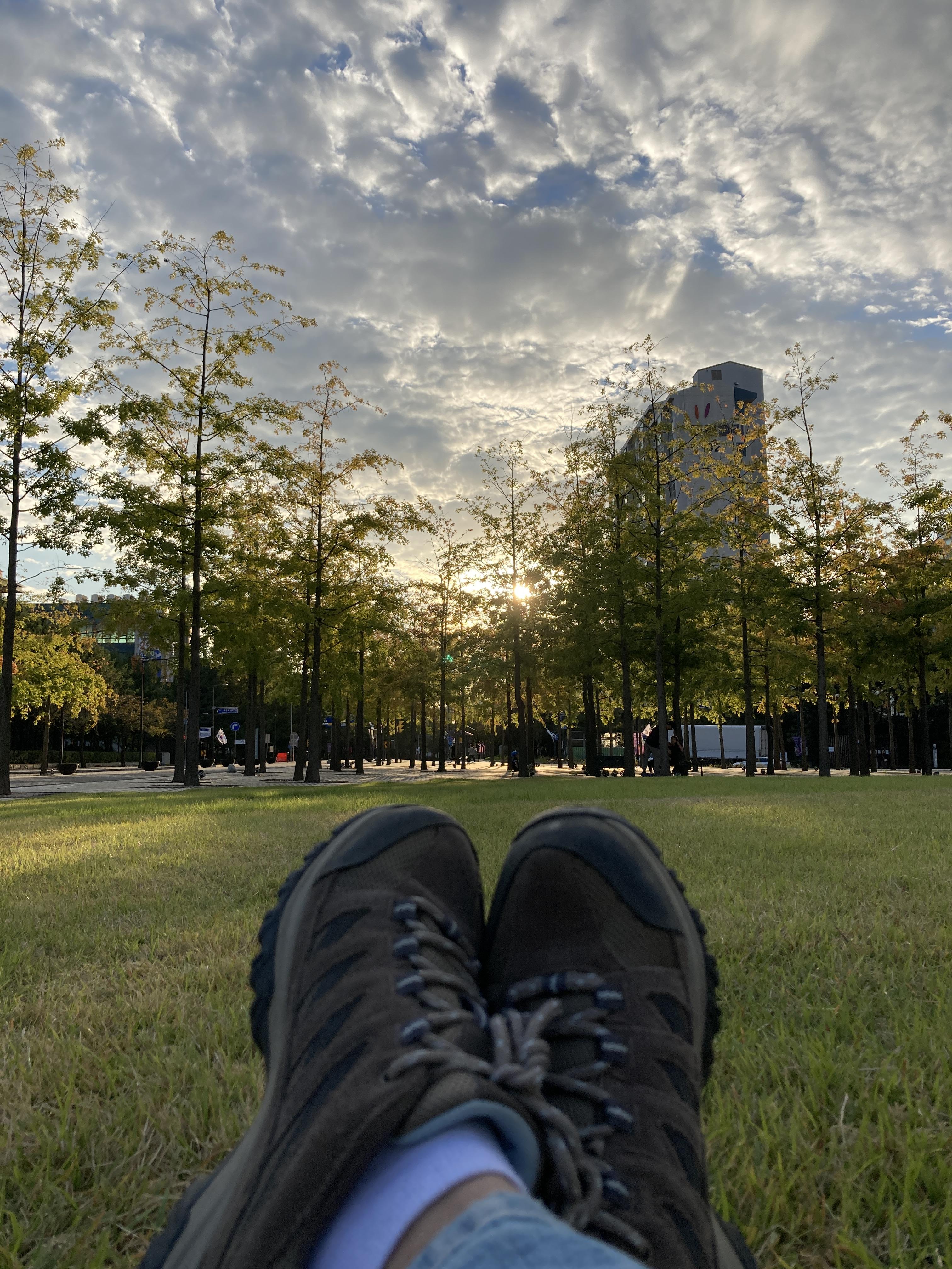 어제 캘리방 대화가 생각나서 누울만한 잔디밭을 찾아보리라 하고 자전거 끌고 나갔다.